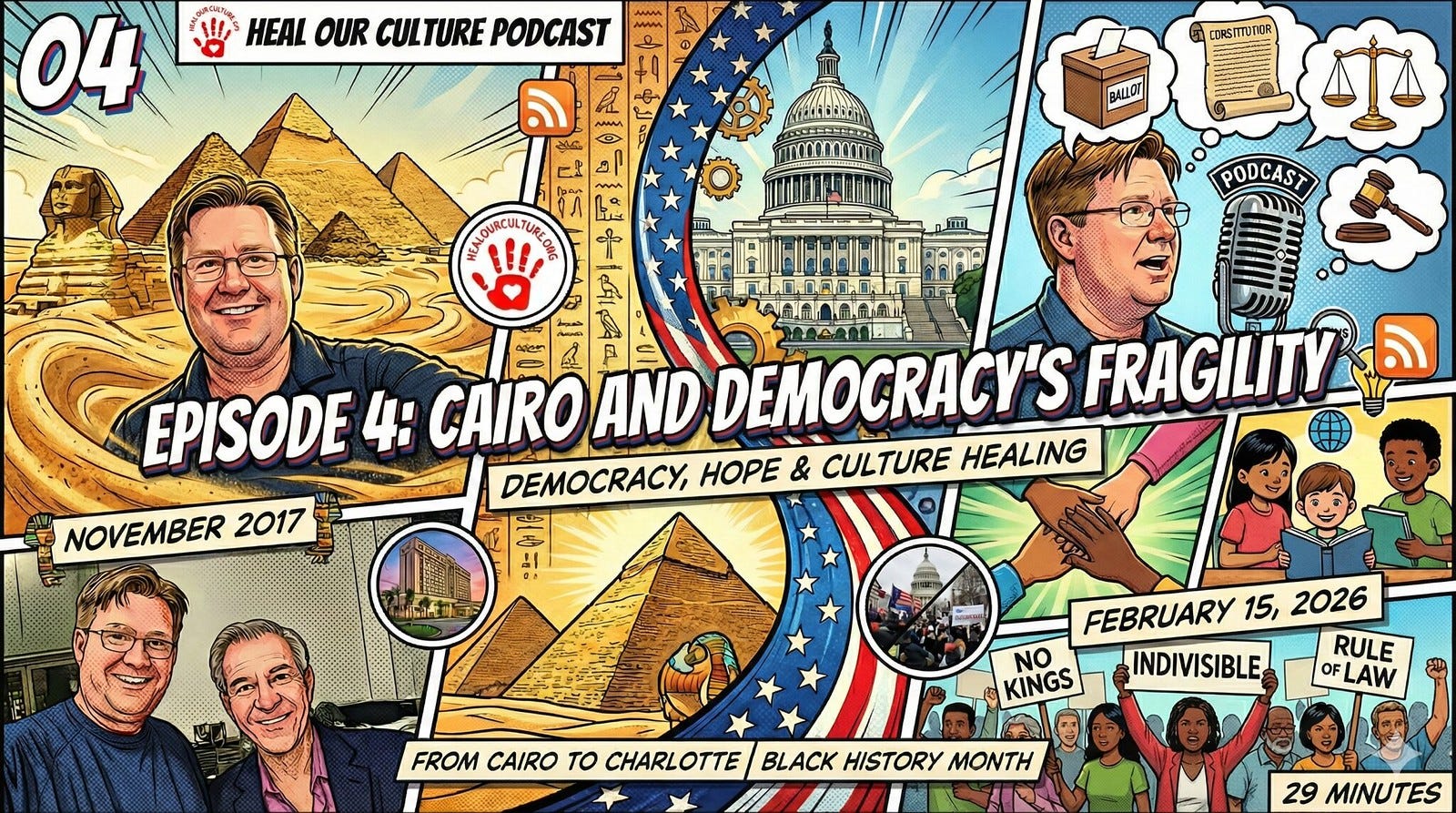 Wes Fryer records episode four of the Heal Our Culture podcast from Charlotte, North Carolina on February 15, 2026, framing it as a “letter to the future” for his unborn grandchildren. He shares a story from a November 2017 trip to Cairo, Egypt to speak at the Ed Forum conference, including visiting the pyramids, the Sphinx, and the Cairo Museum, and learning about the historic Hotel Mena meeting before the 1945 Yalta Conference. He credits the trip’s guidance and context to Ahmed Ragheb, a retired U.S. Air Force colonel and family friend (Muslim married to a Jewish wife), whose career connects to Wes’s father’s Vietnam-era F-4 service and later pilot training leadership; Wes also recalls the Iranian hostage crisis era at Columbus Air Force Base. Wes recounts Ahmed’s explanation of Egypt’s post–Arab Spring politics, noting Mohamed Morsi’s 2012–2013 presidency and the subsequent military takeover that preceded President Abdel Fattah el‑Sisi’s rule beginning in 2014, and uses this to reflect on democracy’s fragility and the dangers of populism. He connects these themes to the United States in February 2026, describing concerns about rising authoritarianism, voter suppression, and challenges to democratic institutions, and references recent killings of U.S. citizens in Minneapolis by federal agents and reports of masked, unbadged arrests and detentions, including incidents in Charlotte. Wes describes his own oath to defend the U.S. Constitution as a 1992 U.S. Air Force Academy graduate, his path out of pilot training and into education, and his ongoing media literacy work since 2019, including the “Conspiracies and Culture Wars” inquiry project (medialiteracy.wesfryer.com/concw) and his effort to “reclaim our news feeds” through news.wesfryer.com using Flipboard and a Federated Reader project built with AI. He cites polarized narratives around the January 6 insurrection, presidential pardons for those involved, disputes over the 2020 election, and differing accounts across platforms as reasons for prioritizing trusted sources. He also points listeners to the “Wes and Shelly Share” podcast (episode 39) discussing snow days and resistance work, including involvement with Indivisible and Indivisible Charlotte through Caldwell Presbyterian Church. The episode closes with a call to be “culture healers” rather than “culture warriors,” to sustain hope and community, and to defend democratic values and rights—especially voting rights—while recognizing the long historical struggle for justice highlighted during Black History Month.